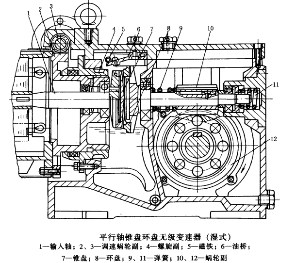 這種變速器具有傳動平穩(wěn)、噪聲低、結(jié)構(gòu)緊湊、變速范圍大、恒功率特性好的特點,在中高速范圍運轉(zhuǎn)時,傳動效率達80%~90%,滑差率<3%。在運轉(zhuǎn)或靜止時均可調(diào)速。