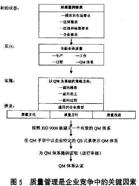 圖5 對(duì)本文所討論的企業(yè)競(jìng)爭(zhēng)中的重要因素——質(zhì)量管理進(jìn)行總結(jié)。出發(fā)點(diǎn)是對(duì)各個(gè)方面提出的質(zhì)量要求作詳細(xì)說明。為滿足質(zhì)量要求作出的反應(yīng),是提出全面企業(yè)質(zhì)量概念,這包括與產(chǎn)品、服務(wù)、過程和系統(tǒng)相關(guān)的質(zhì)量元素。