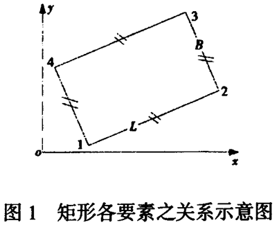為限制整個圖形的整體位移旋轉(zhuǎn).選擇一基點(diǎn)及旋轉(zhuǎn)角限制3 個自由度,2 對邊的長度(L 、B )限制2 個自由度,這時的矩形就是約束一致,即該矩形是唯一確定的,其各點(diǎn)坐標(biāo)由下列式子確定: